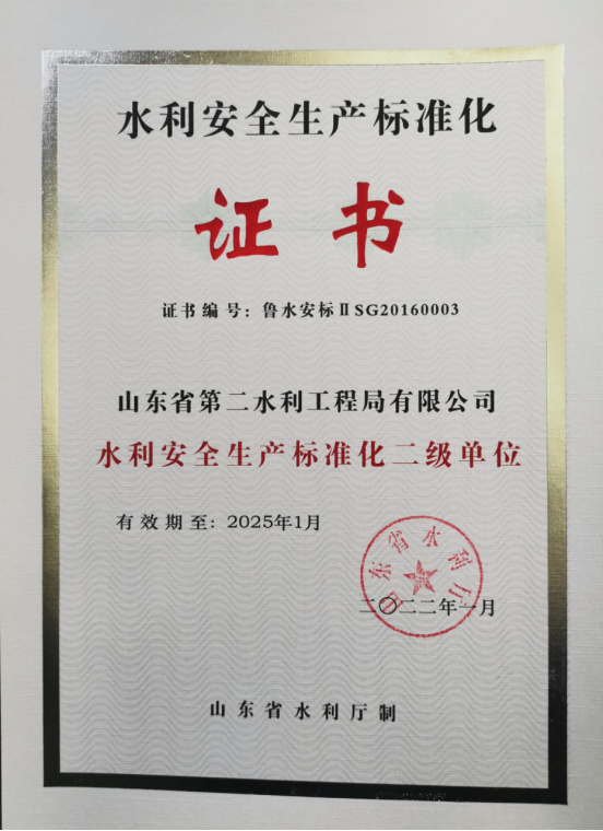 二局有限世俱杯最新官网_世俱杯(中国)于近日顺利通过了山东省水利厅水利安全标准化二级达标企业延期换证。
