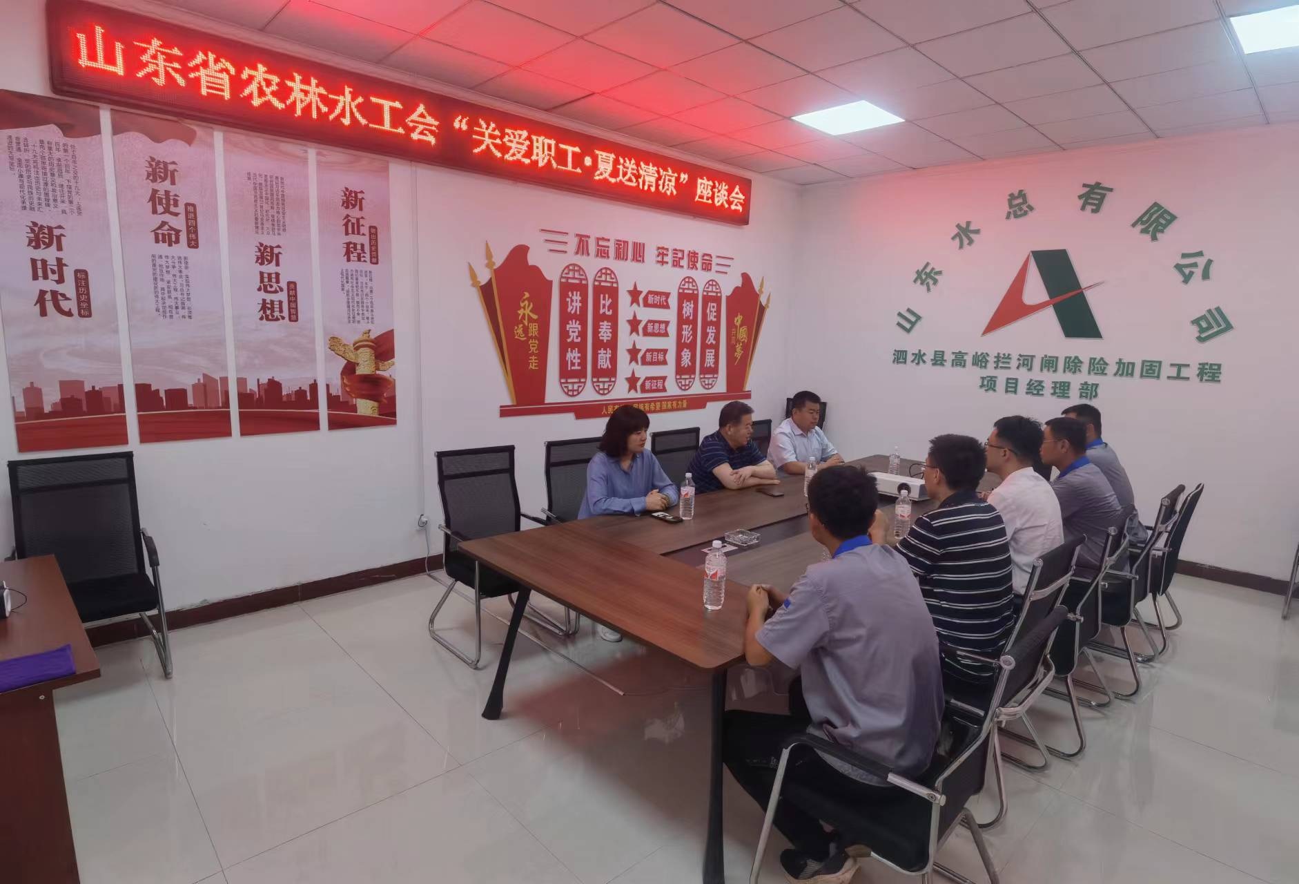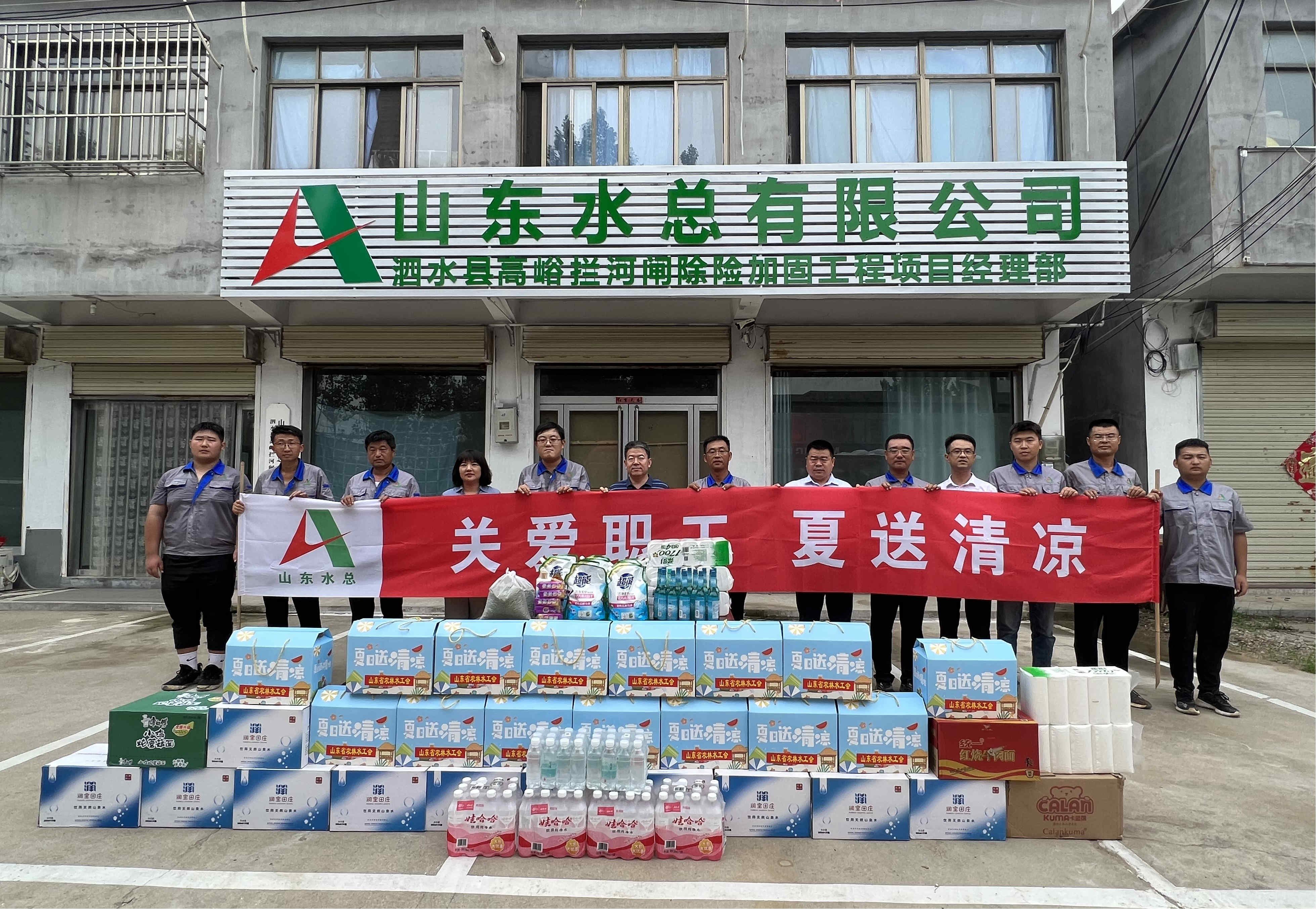 7月19日,山东省农林水工会主席张志刚一行到世俱杯最新官网_世俱杯(中国)泗水县高峪拦河闸除险加固工程开展“夏送清凉”慰问活动。世俱杯最新官网_世俱杯(中国)党委副书记、工会主席周少林,党委组织部部长孙凌,第七分世俱杯最新官网_世俱杯(中国)总经理韩栋,副总经理常征陪同参加慰问。