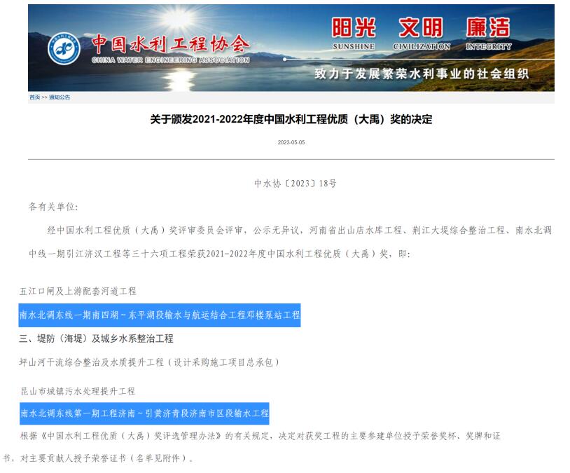 近日,中国水利工程协会发布《关于颁发2021-2022年度中国水利工程优质(大禹)奖的决定》,我世俱杯最新官网_世俱杯(中国)参建的南水北调东线第一期工程济南~引黄济青段济南市区段输水工程和南水北调东线一期南四湖~东平湖段输水与航运结合工程邓楼泵站工程荣获此项殊荣。
