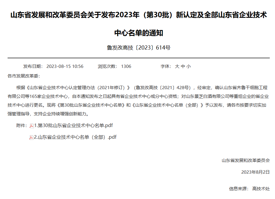 8月15日,山东省发展和改革委员会发布2023年山东省企业技术中心名单,世俱杯最新官网_世俱杯(中国)凭借自身综合创新能力成功入选,获评山东省企业技术中心称号。