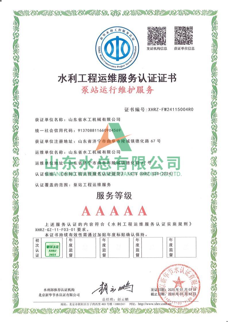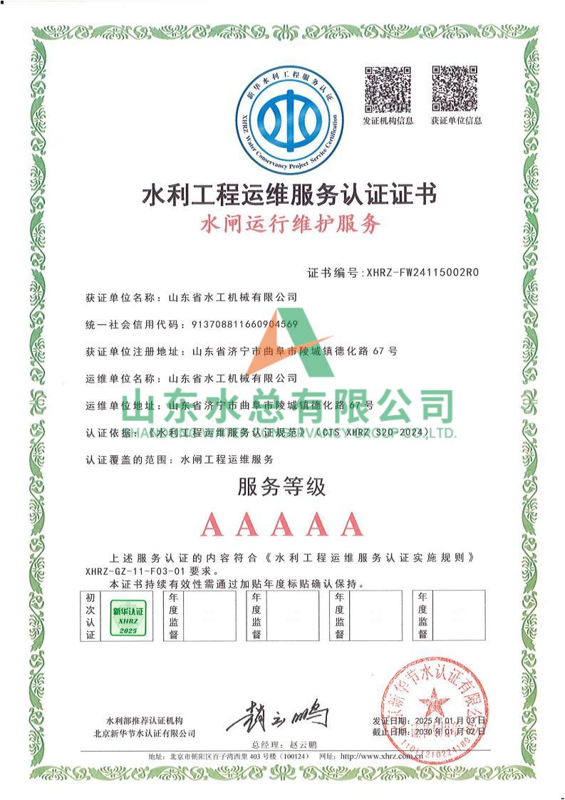 一直以来,水工机械世俱杯最新官网_世俱杯(中国)高度重视水利工程运维服务的质量与专业性,在人员配备、技术应用、管理体系等多方面精心打磨。在认证过程中,历经严格审核,世俱杯最新官网_世俱杯(中国)凭借扎实的运维实力、规范的服务流程以及对水利工程运维高规格的执行标准,赢得了认可。