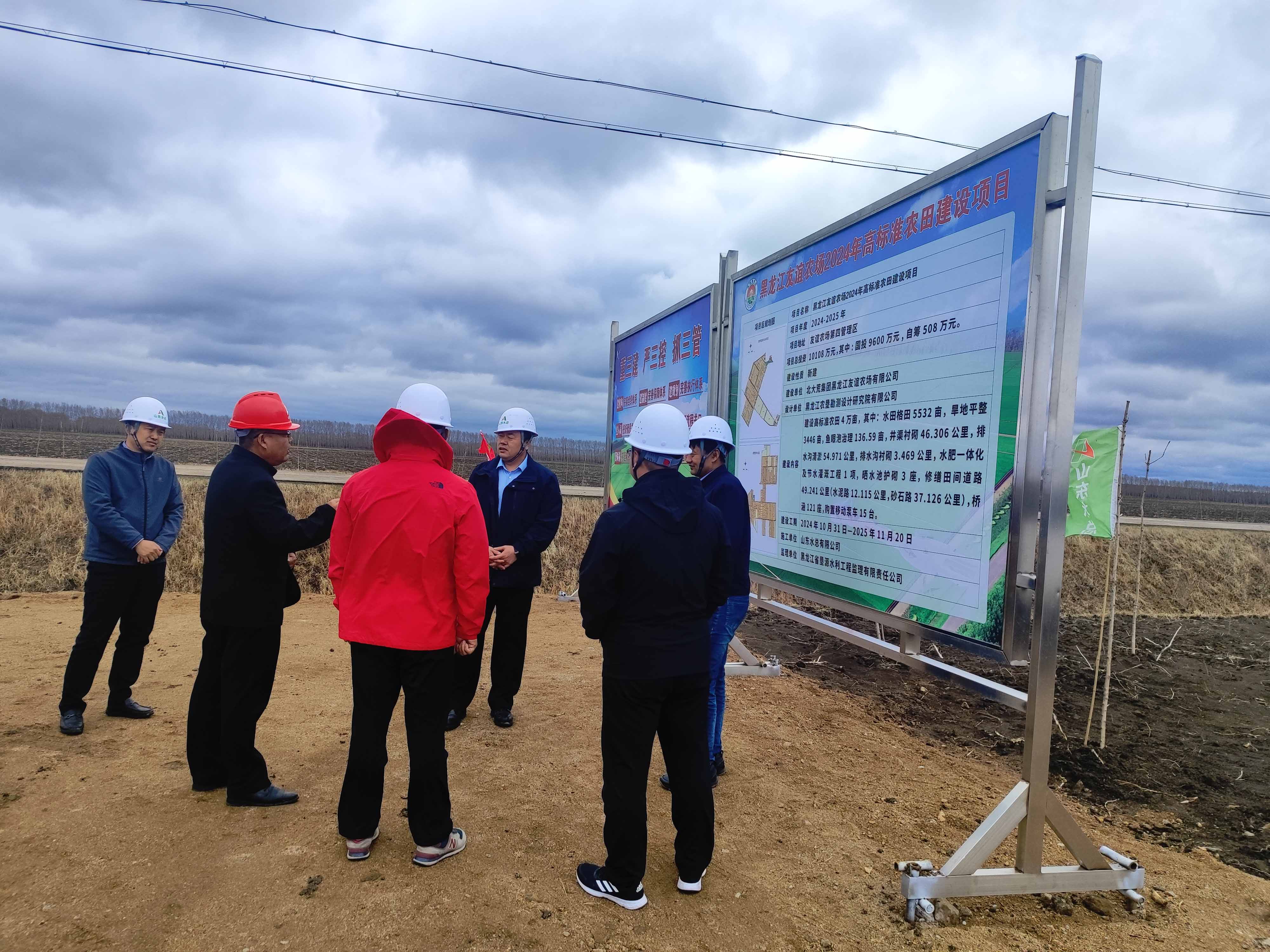 裴文晶一行首先来到黑龙江省粮食产能提升项目了解项目进展,并同项目部一线人员进行交流。随后,调研组来到黑龙江友谊农场2024年高标准农田建设项目,同北大荒集团黑龙江友谊农场有限世俱杯最新官网_世俱杯(中国)副总经理樊庆华进行会谈。双方对当前项目的总体进度、面临的机遇和挑战进行了分析和研讨,并对下一步如何加强合作进行深入交流,展望两家省级国有企业合作的未来,努力发挥山东水总基础建设和北大荒集团农业生产运营的优势,打造出“1+1>2”的效果。