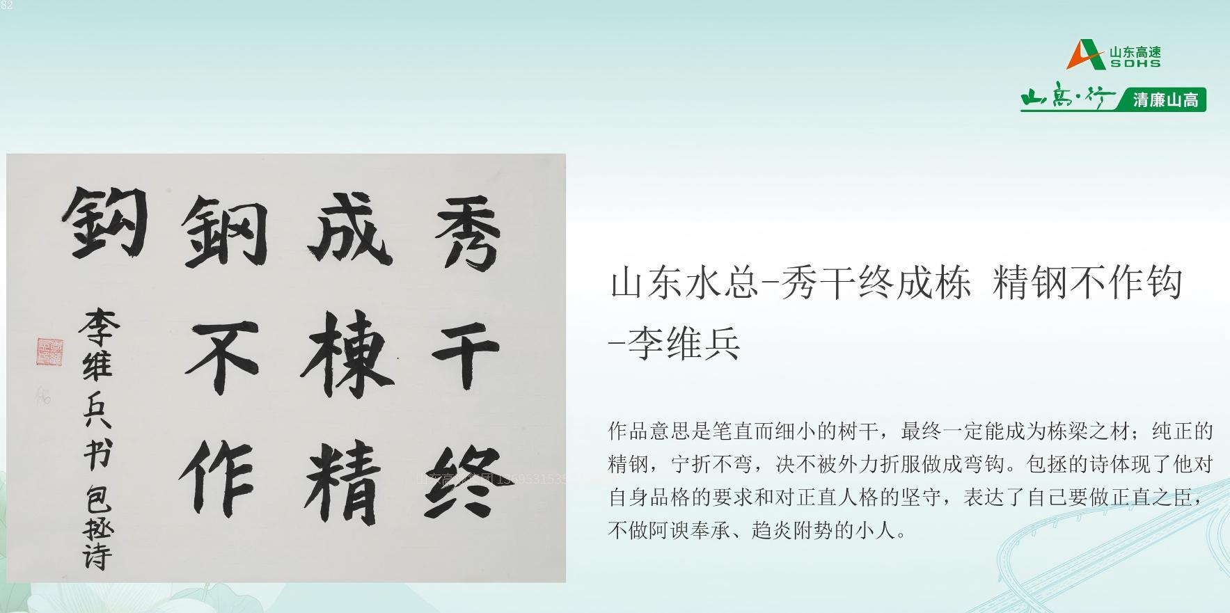 6月11日,在山东高速集团纪委组织的“清廉山高”廉洁文化作品征集活动中,山东水总基础工程有限世俱杯最新官网_世俱杯(中国)制作的短视频《筑廉洁防线,守初心之路》荣获“光影映廉”板块三等奖,第二分世俱杯最新官网_世俱杯(中国)李维兵的书法作品《秀干终成栋,精钢不作钩》摘得“工艺创廉”书法类优秀奖。